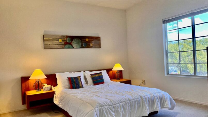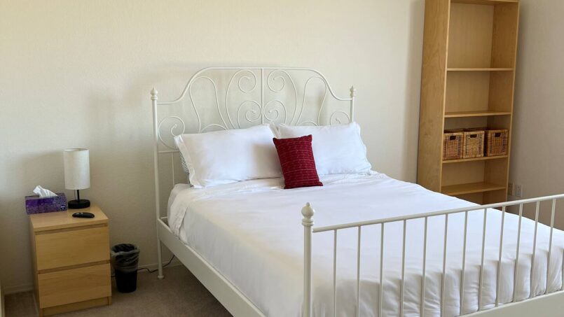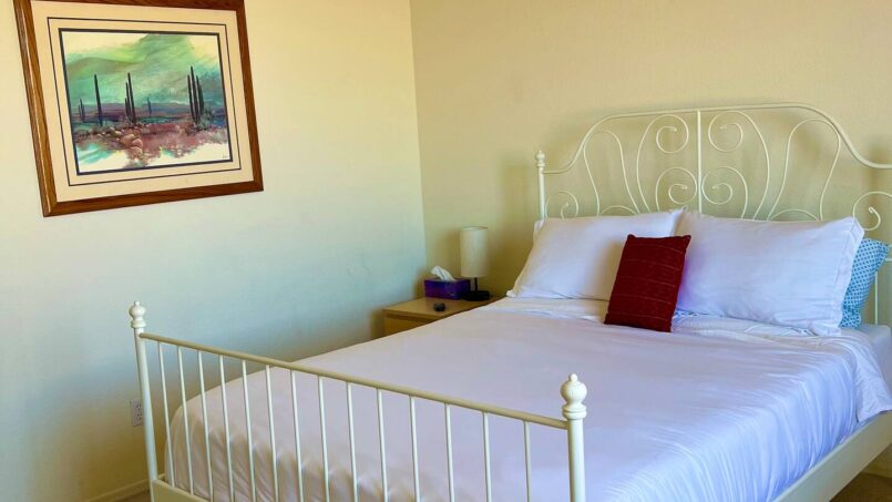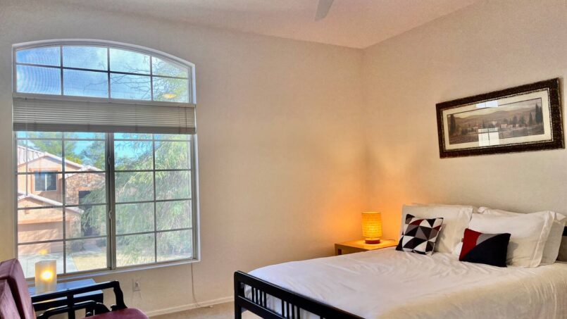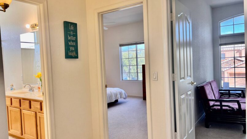 A guest bedroom with a nearby full bathroom
