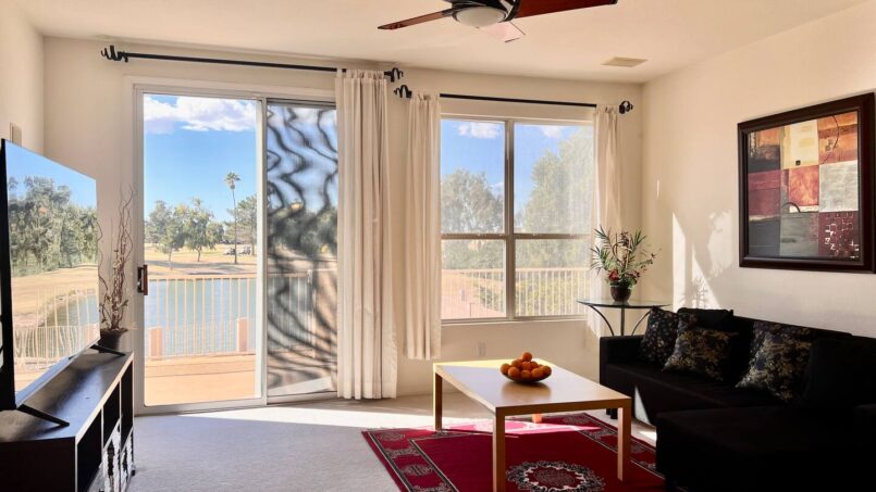 The upstairs entertainment lounge is a highlight—complete with a 70″ 4K Smart TV, cozy seating, and direct access to a large balcony overlooking the lake, pool, and golf course.