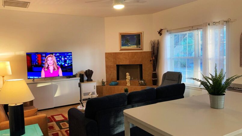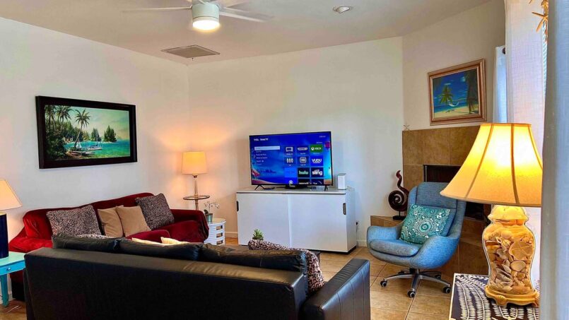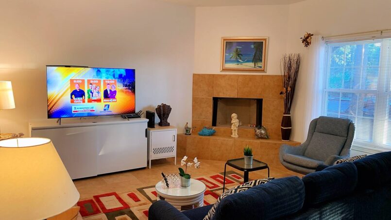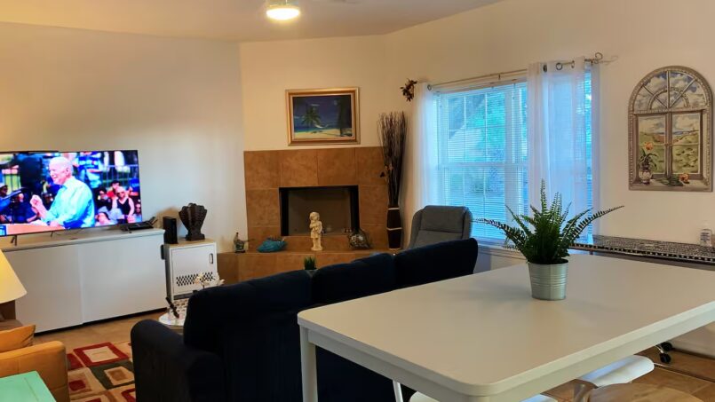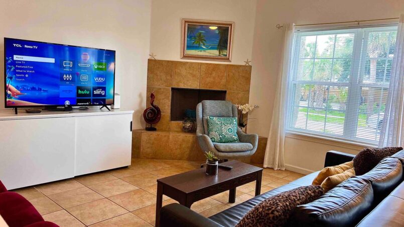 In the living room, you’ll find a decorative fireplace and two futons, comfortably accommodating up to two additional guests. The fully upgraded open-concept kitchen includes brand-new granite countertops and a modern refrigerator—perfect for home-cooked meals.