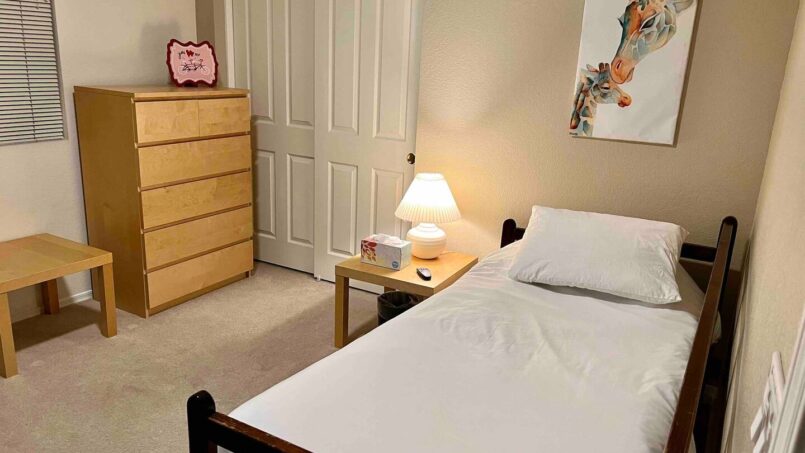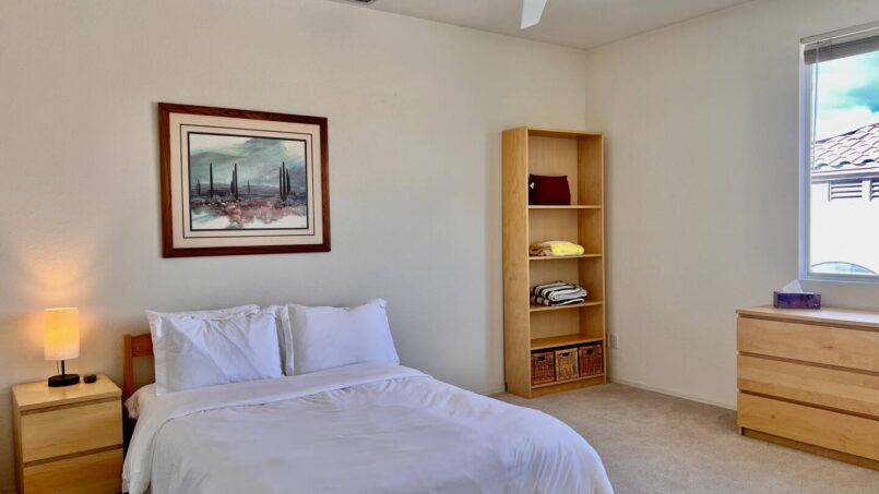A guest bedroom with a nearby full bathroom