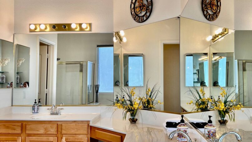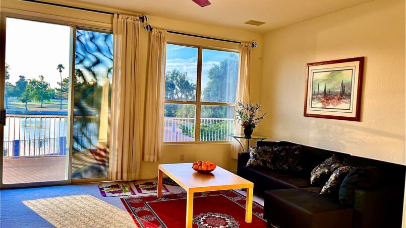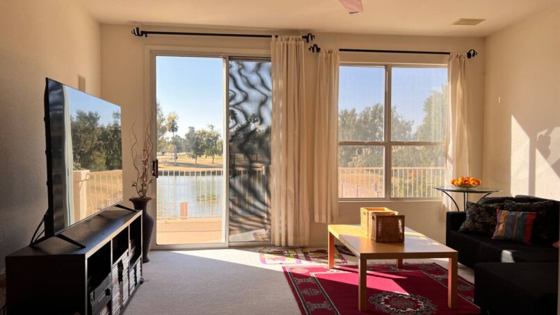 The upstairs entertainment lounge is a highlight—complete with a 70″ 4K Smart TV, cozy seating, and direct access to a large balcony overlooking the lake, pool, and golf course.